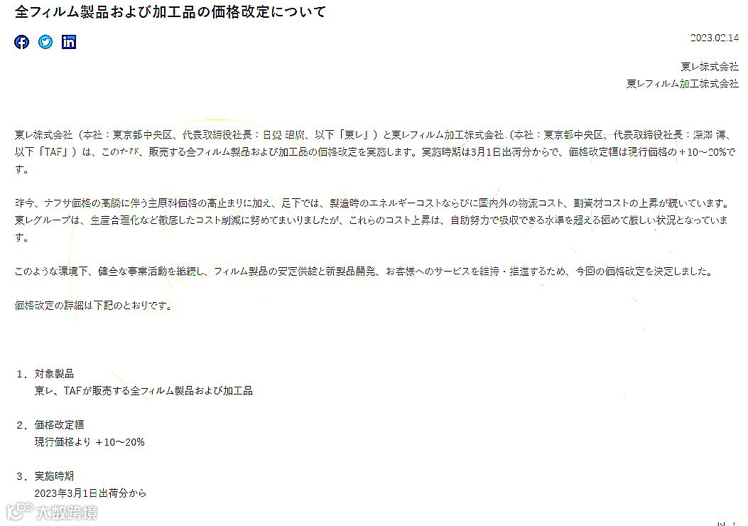2月14日,日本东丽集团宣布,自3月1日起上调销售的所有胶片产品及加工品,涨幅为现行价格的10~20%。