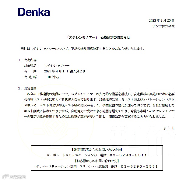 2月20日,日本Denka株式会社宣布苯乙烯单体(SM)将从4月1日交货开始提价,涨幅为10日元/kg(约合515元/吨)。