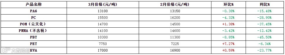 2023年3月份工程塑料市场涨跌互现。各产品价格上涨因素不同,成本面支撑,部分厂家库存较为紧张,对后市信心充足;价格下跌主要因供大于求矛盾加剧,贸易商出货承压,成本面支撑力度减弱。