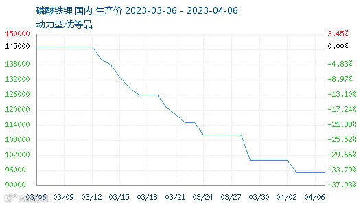 据生意社数据,磷酸铁锂短短一月时间里,从145000元/吨跌至96000元/吨,较最高价大跌49000元/吨,跌幅高达33%!