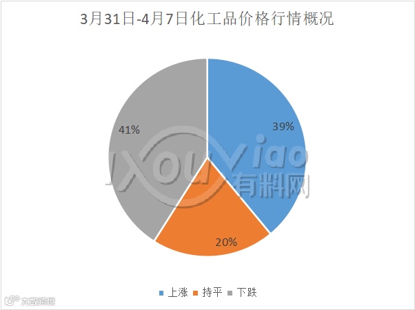 “银四”以来,化工市场行情较3月同期略有起色。3月31日-4月7日,在有料网监测的111个化工品中,价格上涨的产品有44个,45个产品价格下跌,22个持平。虽说如此,但在所有涨价产品中,涨幅都以小涨居多,总体而言,化市初见起色但仍有下行风险。
