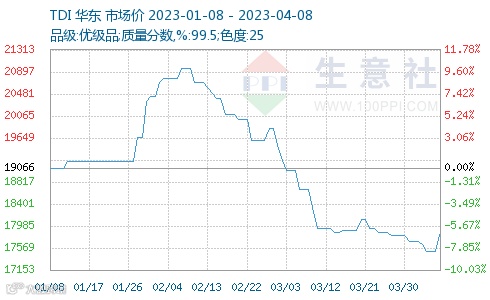近期国内TDI市场逆转向下且跌势加速,截止至3月底华东地区价格在17400-17800元/吨。而3月初华东市场价尚在18600-19000元/吨左右,自2月初则在20500-21000元/吨,时隔一个月跌幅达1200元/吨。
