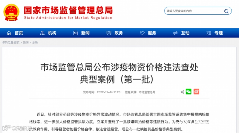 据国家市监局官网显示,近期针对部分药品价格异常波动情况,国家市监局已经开展了一些列查处行动。第一批涉疫物资价格违法查处共10起,其中6起已结案,最高拟罚款50万元!