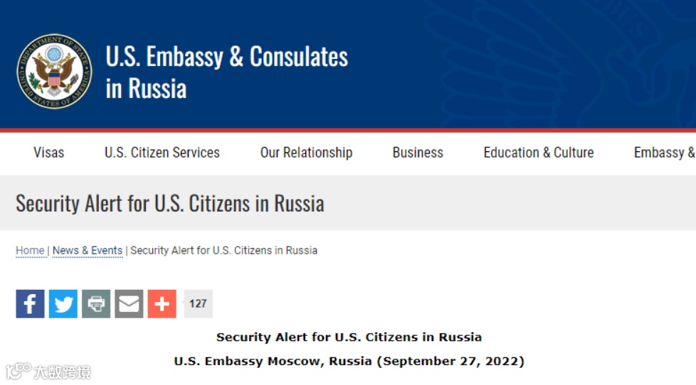 美大使馆公告提及,俄罗斯21日已进行部分动员,俄罗斯可能将拒绝承认双重国籍人员的美国公民身份,拒绝这些人获得美国的领事协助,并阻止他们离开俄罗斯,还可能征召这些具有双重国籍的人服兵役。