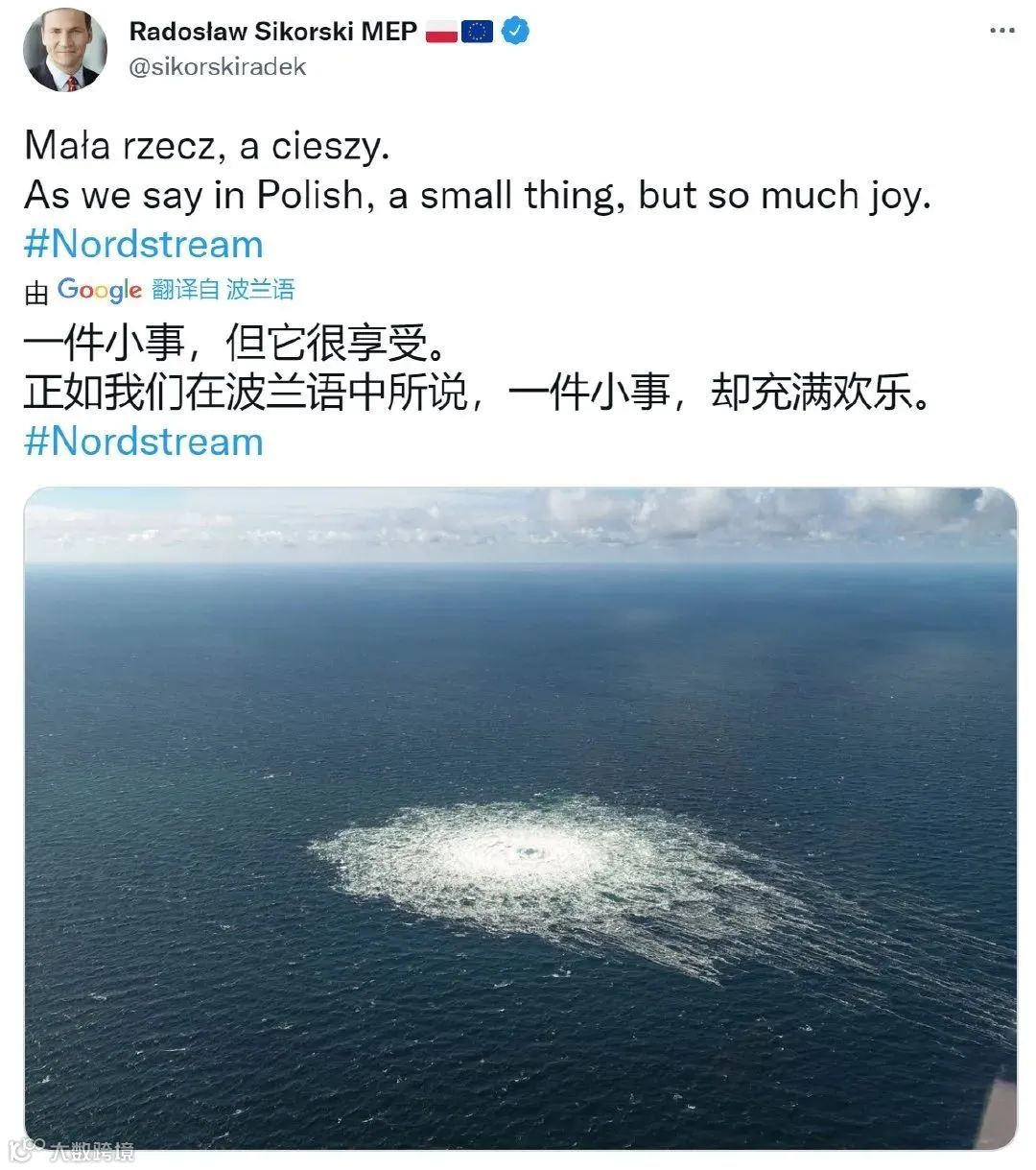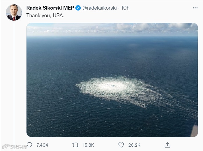 西科尔斯基发了“北溪”管道发生事故的现场图,并配文称:“谢谢你,美国。”