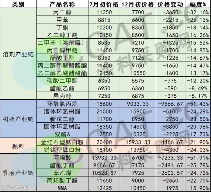 下半年以来涂料产业链部分原材料价格变动