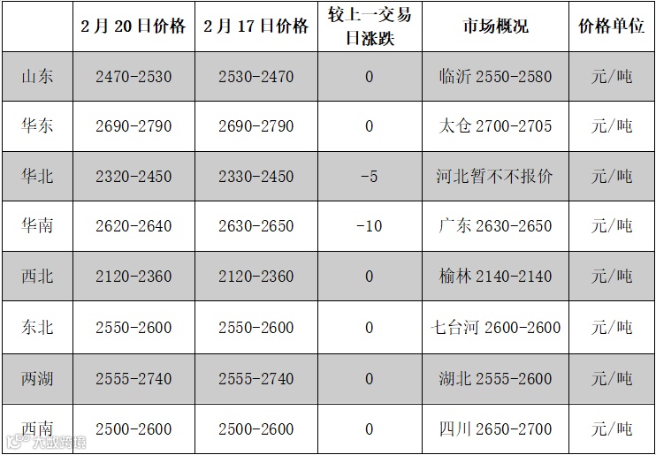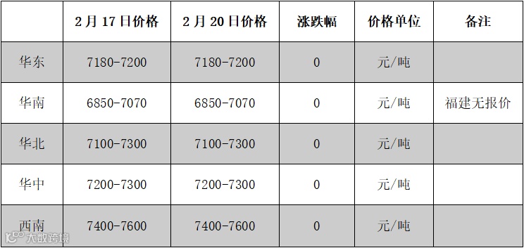 2月20日,国内部分炼厂装置依旧停车检修,甲苯整体开工大体平稳,然原油预期持续下跌,且下游需求仍显弱势。甲苯市场价格僵持为主,华东市场价格商谈在7180-7200元/吨,价格环比持稳;华南市场价格商谈在6850-7050元/吨,价格环比持稳。