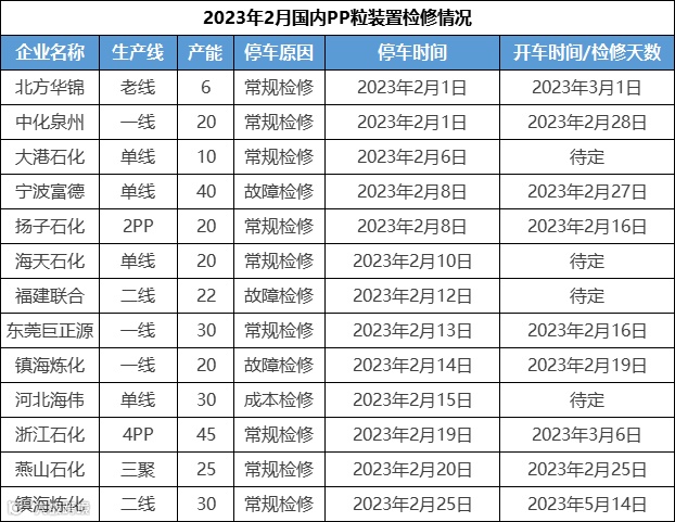 据数据统计,2月份国内聚丙烯检修装置涉及产能318万吨。其中大港石化、扬子石化、镇海炼化为临时检修,停车时间较短。利和知信、浙江鸿基石化、北方华锦等企业未有重启计划。