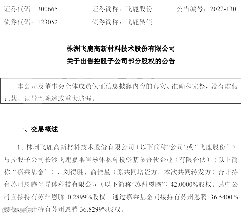 飞鹿股份与嘉乘基金、刘得胜、俞佳星以人民币25,000,000元向朝来芯火转让合计持有的苏州恩腾25.00%股权;以人民币3,780,000元向飞腾二号(苏州恩腾的员工持股平台)转让合计持有的苏州恩腾4.50%股权。
