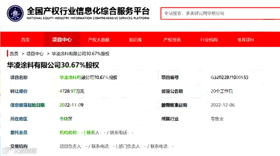 据全国产权行业信息化综合服务平台,华凌涂料有限公司30.67%股权挂牌转让,转让底价为4728.97万元。转让方为中国昊华化工集团股份有限公司。