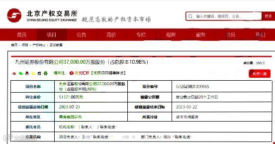 北京产权交易所信息显示,中国石油化工集团有限公司挂牌转让九州证券3.7亿股股份(占总股本10.98%),转让底价为5.14亿元。