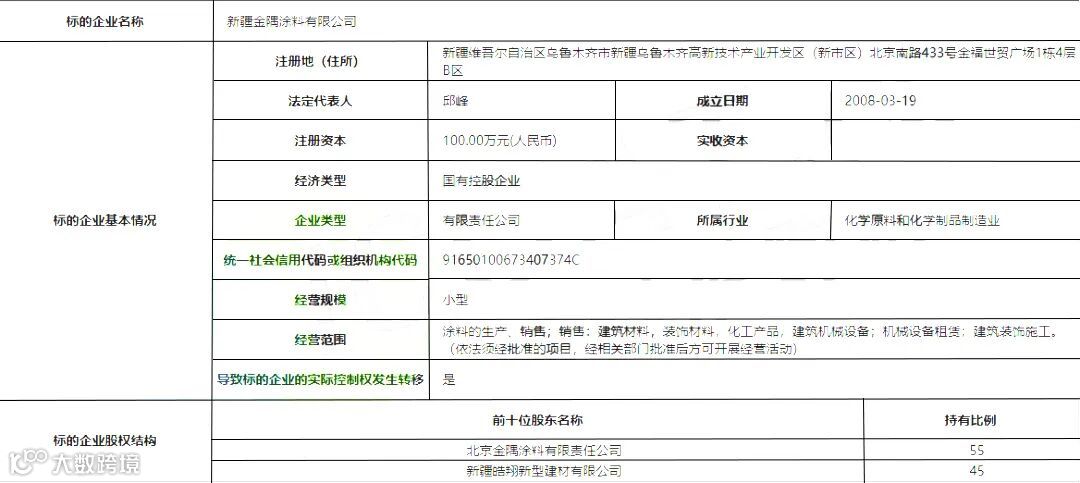 北京产权交易所发布《新疆金隅涂料有限公司55%股权》公告,标的企业名称为新疆金隅涂料有限公司,标的企业股权结构前十位股东名称持有比例为北京金隅涂料有限责任公司55%,新疆皓翔新型建材有限公司45%。