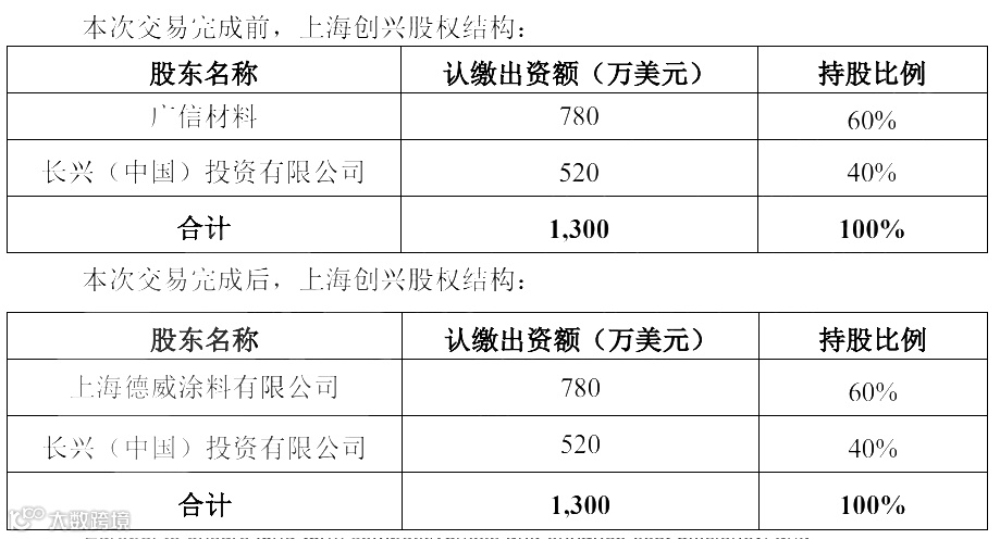 为进一步整合公司资源、优化资产结构,有效降低经营成本、提高运营效率,广信材料与上海德威涂料签署《股权转让协议》,将持有的上海创兴60%股权以及对上海创兴的应收借款本金5275.87万元,合并交易对价为人民币4000万元出售给上海德威涂料。