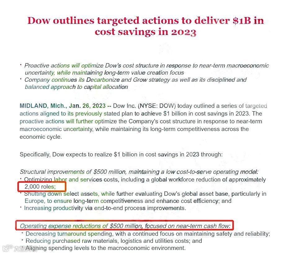去年四季度,陶氏化学营收118.6亿美元,同比降低17%;净利润6.1亿美元,同比下滑64%。因此,陶氏化学宣布将在全球范围内裁员约2000人,并关闭部分生产设施,同时将进一步评估欧洲等地的资产配置。此次裁员规模相当于陶氏化学员工总数的5%。