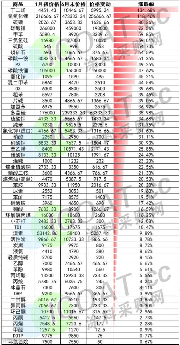 等,包括这些产品衍生产业链方面的石化、煤化等大宗化工原料等,在上半年均出现了大比例的增长。其中丁二烯、氢氧化锂等价格翻倍,氢氧化锂吨价上涨超25万,碳酸锂吨价上涨近20万,这也与上市公司业绩预喜形成了完美呼应。