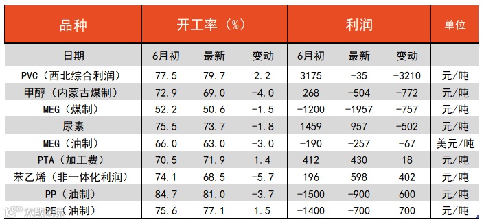 进入6月后宏观加息落地,市场交易衰退预期,走势反转。化工品领先于上游原油开启下跌,跌幅明显超于原油,整体呈现化工品利润压缩,亏损扩大的格局。