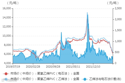 当前国内乙烯法PVC现货的平均价格为6511元/吨,电石法PVC现货的平均价格为6314元/吨。利润在价格下跌中被压缩,外购电石法亏损超过700元,自备电石法亏损超过200元,外购电石的氯碱一体化利润回落过半,但仍有1000左右利润。从成本角度考虑,有一定支撑力度。