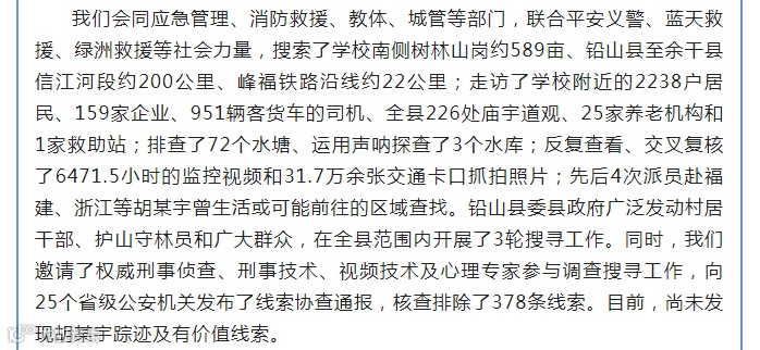 文中称,“我们会同应急管理、消防救援、教体、城管等部门,联合平安义警、蓝天救援、绿洲救援等社会力量,搜索了学校南侧树林山岗约589亩、铅山县至余干县信江河段约200公里、峰福铁路沿线约22公里……”