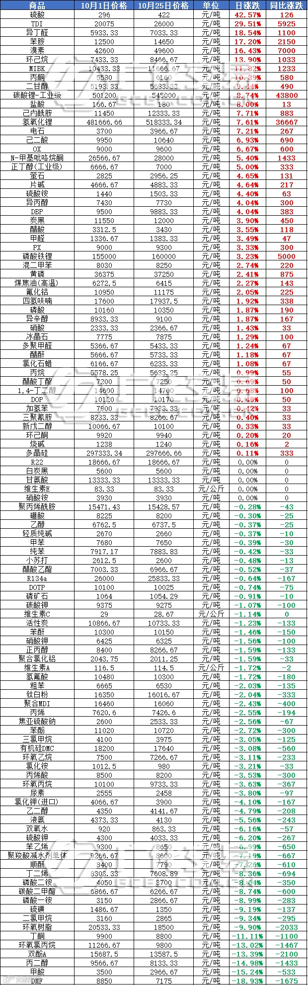涨幅榜前三为:硫酸(42.57%)、TDI(29.51%)、异丁醛(18.54%);
