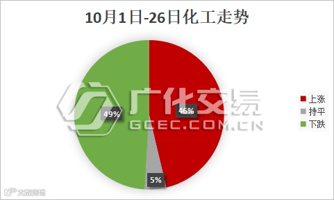 “银十”接近尾声,据广化数据监测,10月化工走势整体平缓,涨跌几近持平。上涨产品共计50种,占大宗榜46%;下跌产品共计53种,占大宗榜49%。