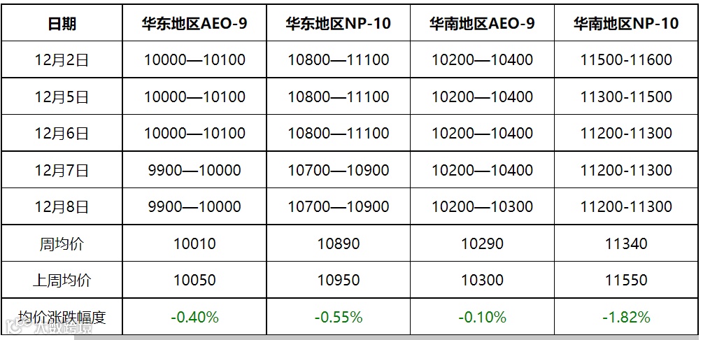 NP-10:市场需求延续弱势,成本面指引作用一般,周内弱势下行。截至上周四,非离子表活含包市场价格:AEO-9华东市场9900—10000元/吨,环比上期报告末跌100元/吨;NP-10华东10700—10900元/吨,较上期报告末跌150元/吨。。