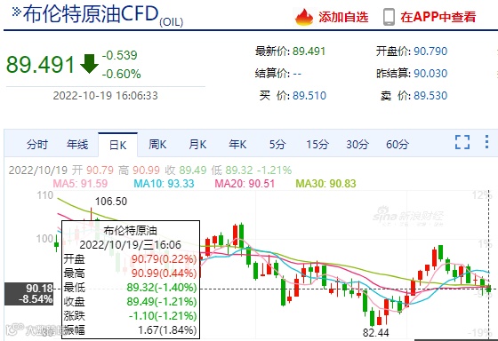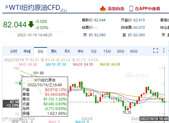 十月以来,国际原油价格大涨大跌,国庆节五连涨后,原油又迎跌势,昨日,国际油价下跌,WTI原油收盘82.81美元/桶。截至发稿,盘中WTI原油价格为82.04美元/桶,WTI原油节后归来曾一度涨至93美元,如今却大跌11%,几乎回吐节日期间所有涨幅!