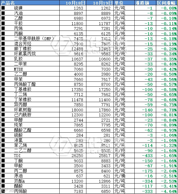 国内近期许多化工品价格呈下跌趋势,19日,广化君监测的原料产品中有37个出现下跌,预计未来原料大涨机会不大,市场震荡运行为主,各位化工老板们还需按需采购。