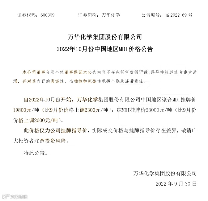 同时,万华化学公告,自2022年10月份开始,万华化学集团股份有限公司中国地区聚合MDI挂牌价19800元/吨(比9月份价格上调2300元/吨);纯MDI挂牌价23000元/吨(比9月份价格上调2000元/吨)。
