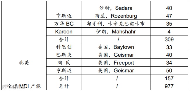在MDI领域,万华化学现拥有265万吨/年产能,产能分布于三个地区,分别是山东烟台110万吨/年,浙江宁波120万吨/年,匈牙利卡辛克巴契卡市35万吨/年。作为全球最大的MDI生产商,万华化学产能占全球产能近三成,而此次停产检修产能占其总产能的41.5%,占比较大。全球MDI产能分布情况见下表。
