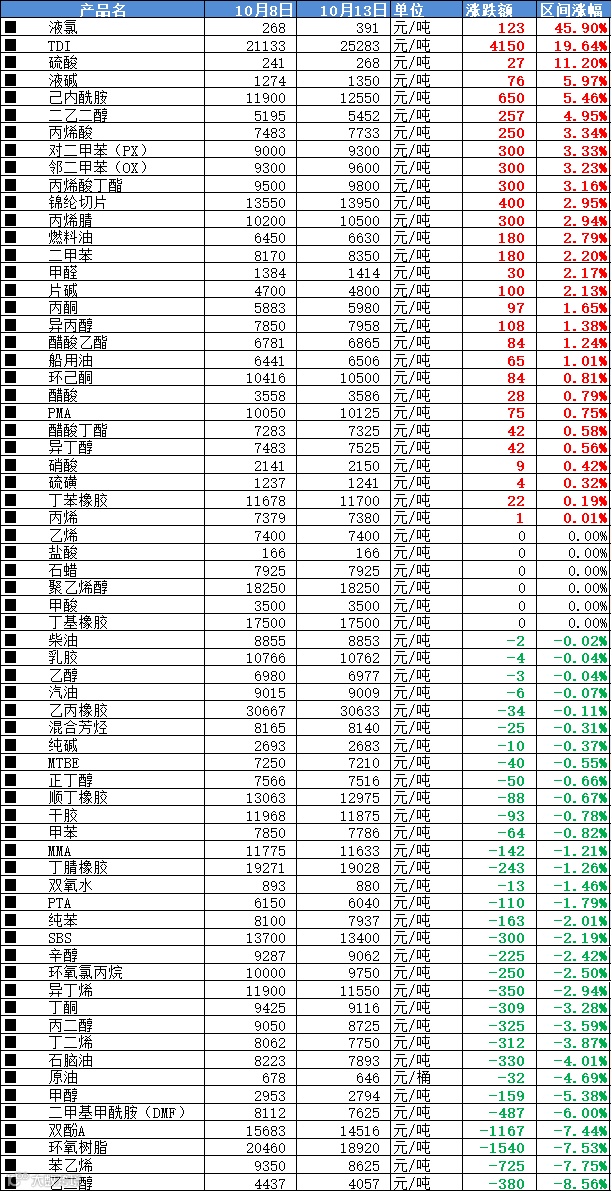 据观察,自10月8日以来,万华化学、华鲁恒升、利华益集团等化工巨头,针对主要产品进行连续3日提价,最高提价达1000元/吨。