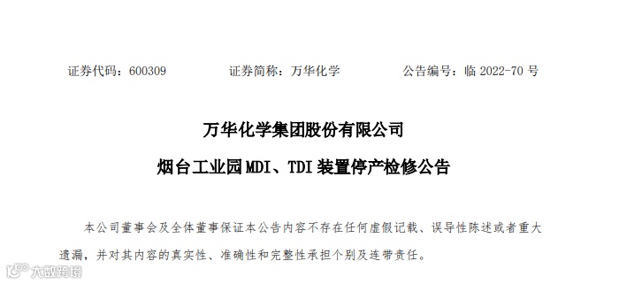 10月10日晚间,万华化学发布烟台工业园MDI、TDI装置停产检修公告。