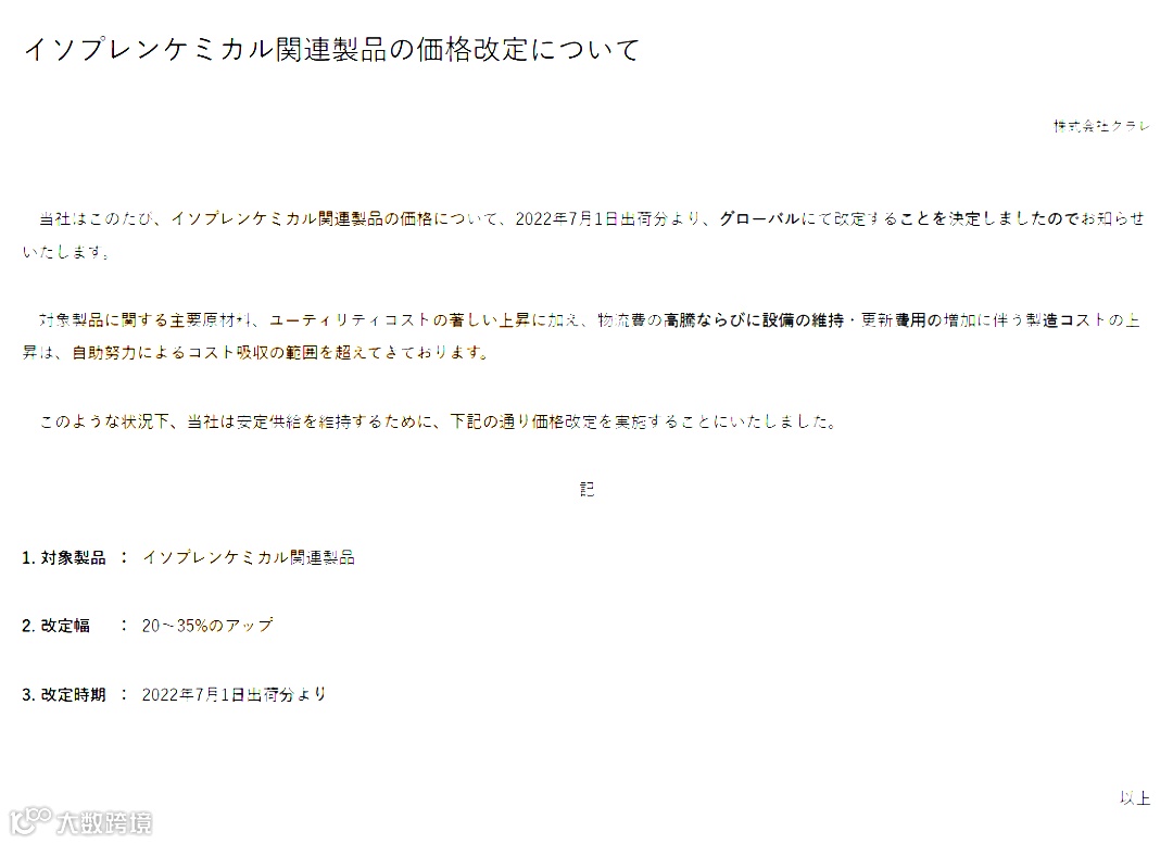 可乐丽:7月1日起,异戊二烯化工相关产品进行全面提价,涨幅为20-35%。