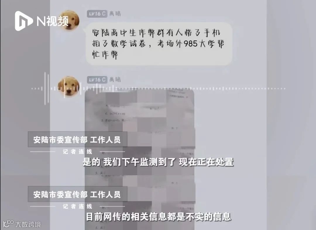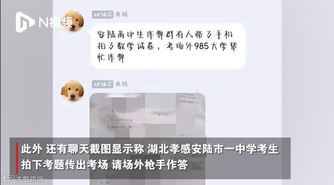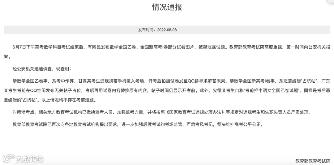 涉数学全国乙卷事,系考中作弊,甘肃某考生违规携带手机进入考场,开考后拍摄试卷发至QQ群寻求解答未果。涉数学全国新高考I卷事,系恶意编辑“占坑帖”,广东某考生考前在QQ空间发布无关帖子占位,考后再用试卷内容替换原有内容,帖子时间仍显示开考前。此外,安徽某考生自称“考前押中语文全国乙卷试题”,同样是考后恶意编辑的“占坑帖”。以上情况均不存在考前泄题。