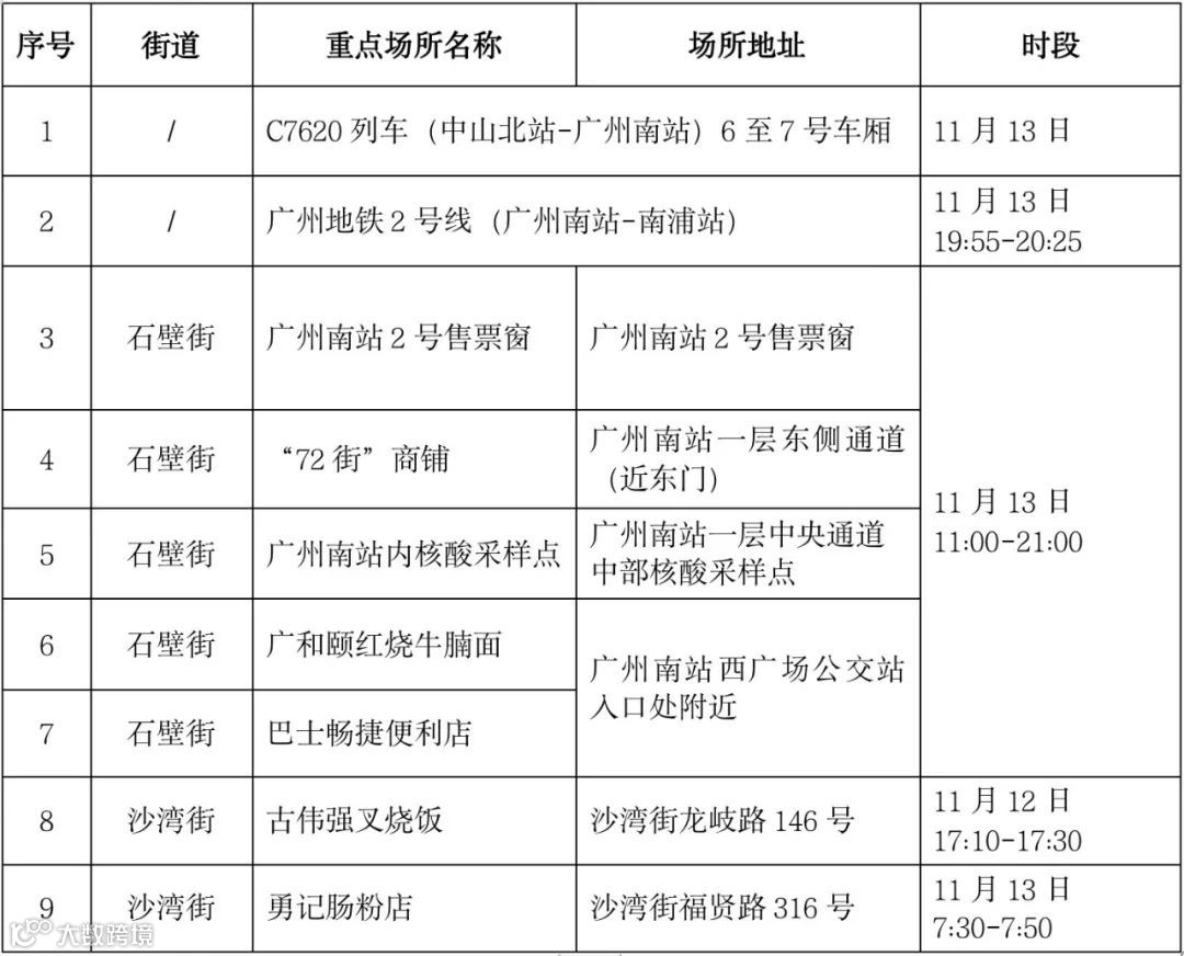 石壁街道:广州南站(2号售票窗、“72街”商铺、一层东侧通道(近东门)、一层中央通道中部核酸采样点、广和颐红烧牛腩面、巴士畅捷便利店);