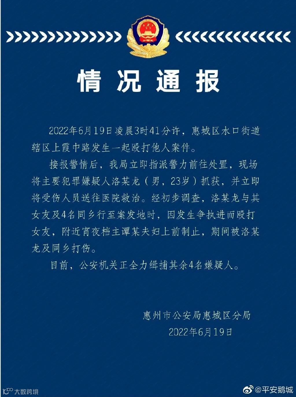 昨晚(19日)8点,惠州惠城区公安发布警情通报,经初步调查,洛某龙与其女友及4名同乡行至案发地时,因发生争执进而殴打女友。附近宵夜档主谭某夫妇上前制止,期间被洛某龙及同乡打伤。