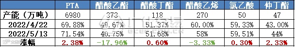 从醋酸下游市场开工来看,当前PTA、醋酸丁酯以及氯乙酸的开工较前期有所提升,而醋酸乙酯以及醋酸乙烯均有所降低。