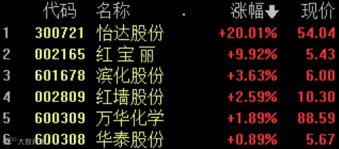 9月5日,受欧洲“断气”影响,A股化工板块走高,环氧丙烷、钛白粉概念股领涨,怡达股份、红宝丽涨停,坤彩科技逼近涨停,滨化股份、国城矿业、振华股份、攀钢钒钛等跟涨。