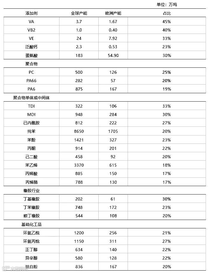 欧洲作为全球第二大化工品生产基地,约占全球化工品销售额18%。其中,MDI占全球产能27%、TDI占全球产能25%,欧洲环氧丙烷产能占全球25%,维生素A占全球产能的49%,维生素E占全球产能的33%,蛋氨酸占全球产能30%,纯碱产能占全球的18%,轮胎出货量占全球20%,欧洲也为全球重要的农药生产基地。
