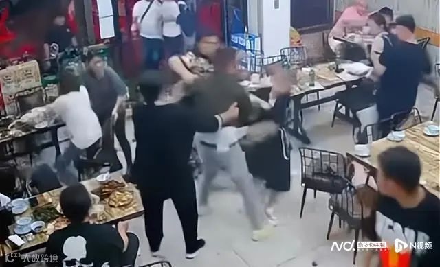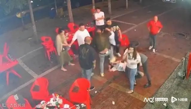 同桌黑衣女子随后手持玻璃酒瓶击打绿衣男子,反被绿衣男子殴打并推倒在地,男子同伴也上前殴打黑衣女子。此时烧烤店外多名男子冲进店内,抓住白衣女子的头发,将其在地上拖拽出店外,随后几人持续用脚踹白衣女子、揪女子头发击打其头部、脸部。