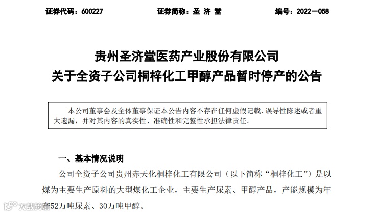 近日,上市公司圣济堂公告了旗下化工生产基地贵州赤天化桐梓化工有限公司暂停甲醇生产的消息。8月16日起,桐梓化工决定停运甲醇装置进行临时检修消缺。至9月13日已完成了对甲醇系统装置设备的消缺处理。但圣济堂研究决定,对桐梓化工甲醇产品实施暂时停产,并表示此举将导致公司2022年度甲醇产量、营业收入同比下滑。