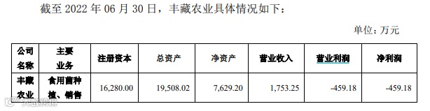 众兴菌业披露公告称,公司于9月5日收到参股公司四川丰藏现代农业的通知,丰藏农业因现金流难以维系,现处于停产状态。丰藏农业主要产品为双孢菇,产能约为15吨/天。公司总资产1.95亿元、净资产仅为7629.20万元。今年上半年,丰藏农业的营业收入为1753.25万元,净利润为-459.18万元。