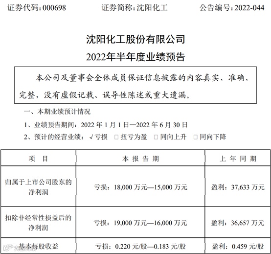 沈阳化工(000698)近日发布2022年半年度业绩预告,预计2022年上半年归属于上市公司股东的净利润亏损15,000万元—18,000万元,上年同期盈利37,633万元,同比由盈转亏;基本每股收益亏损0.220元/股—0.183元/股,上年同期盈利0.459元/股。