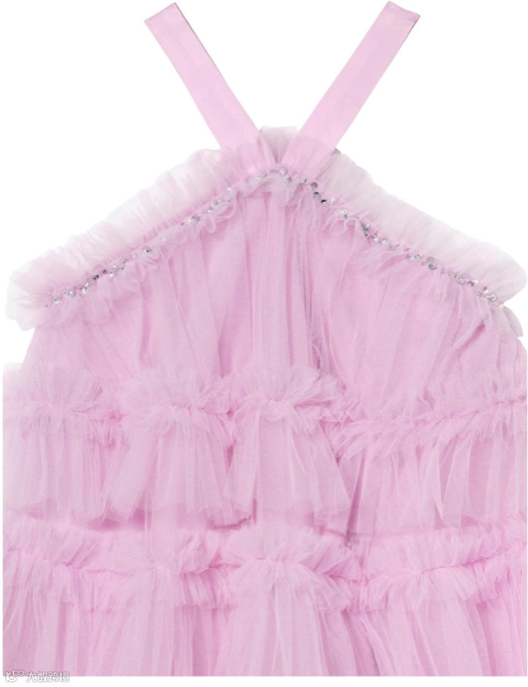 自带梦幻廓形,层叠长褶裙摆随步轻曳。挂脖式领口搭配露肩褶边袖,自然垂落臂间,仙气与优雅兼具。