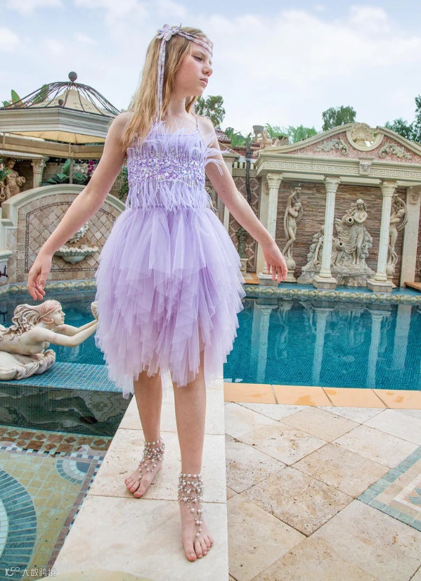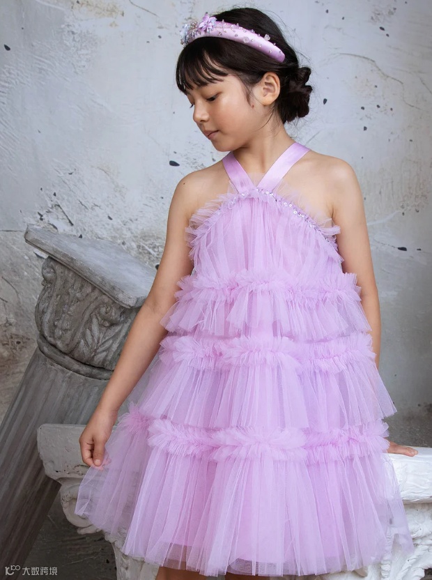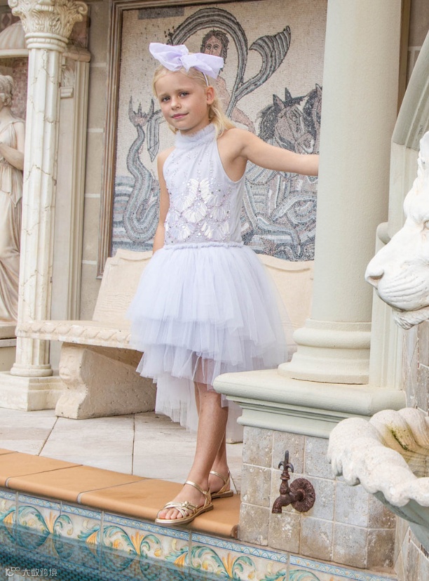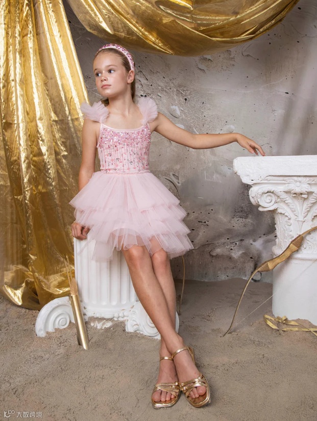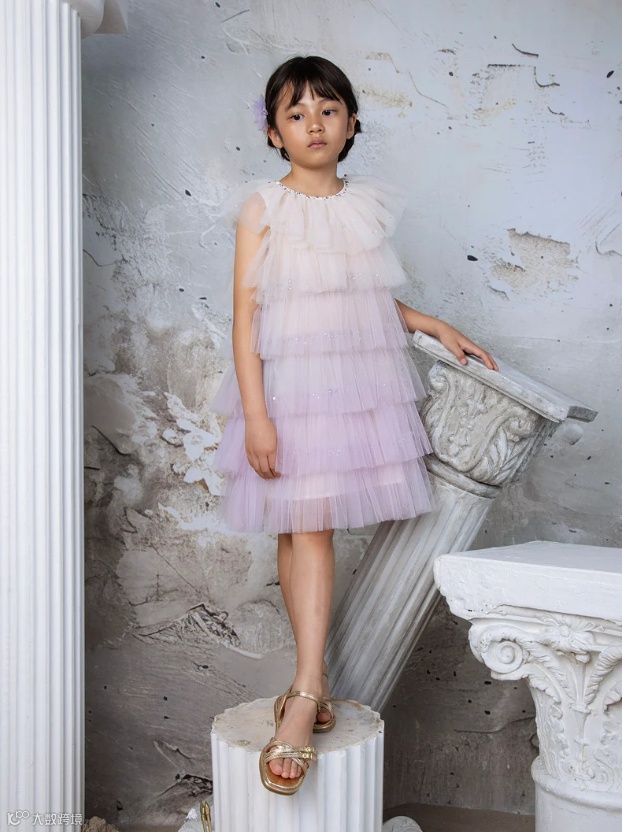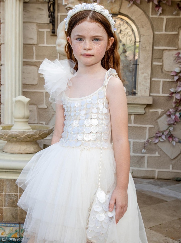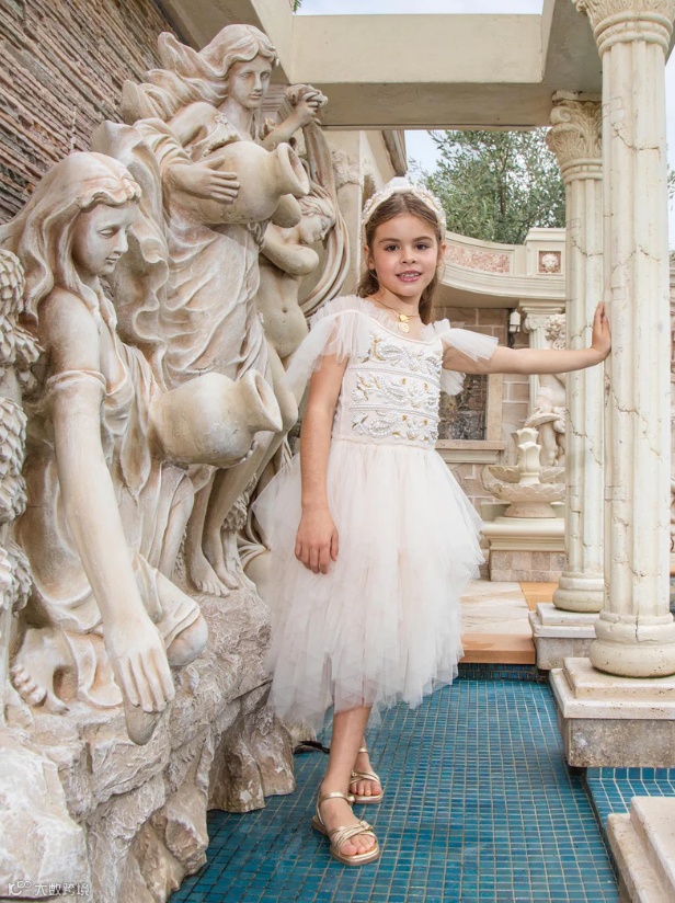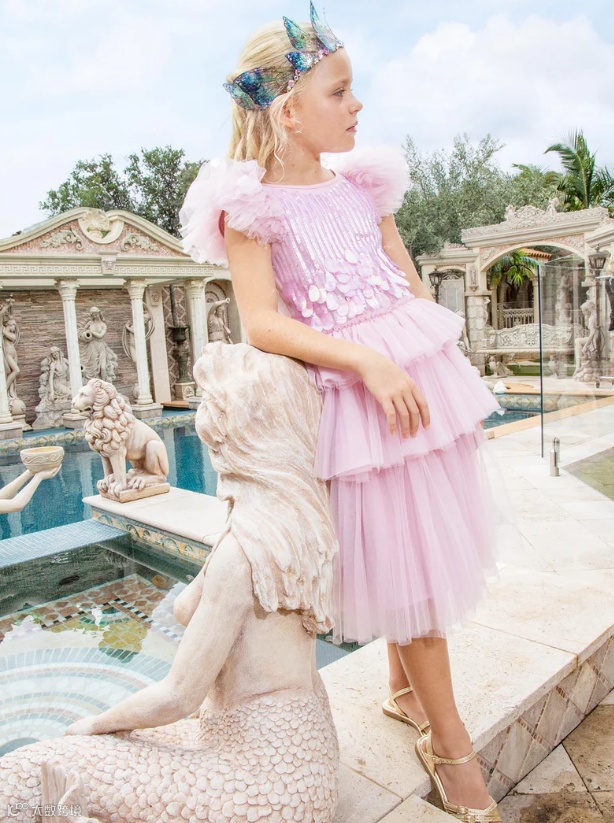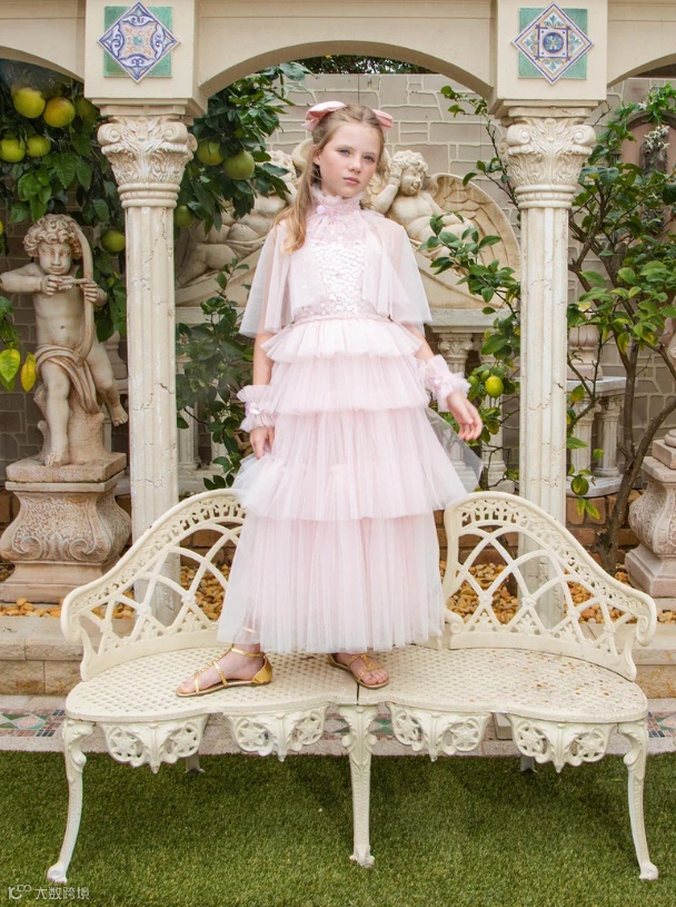 新系列Elysian Tides灵感来自海岸线的光影与潮汐的律动。轻盈的薄纱层叠如浪,手工珠饰与微光亮片仿佛被海水温柔打磨过的碎光,在行走间缓慢流动。色调取自清晨与黄昏的海面,柔和却富有层次。融女神气质与海洋浪漫于一身,专为充满个性、活力和时尚感的小女孩设计。