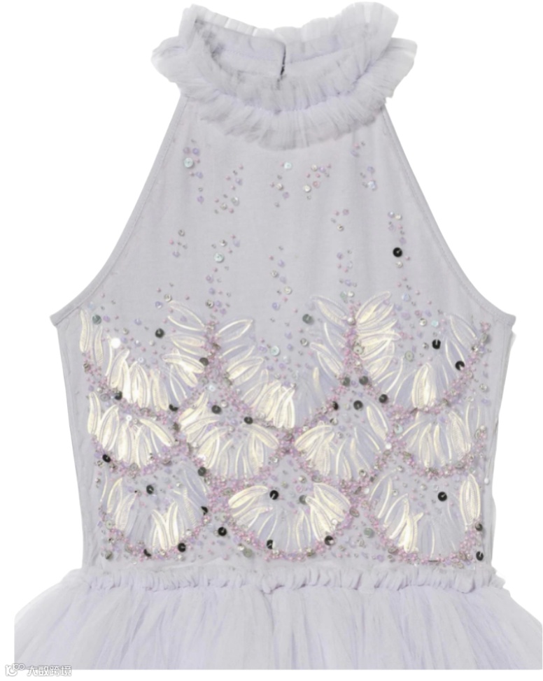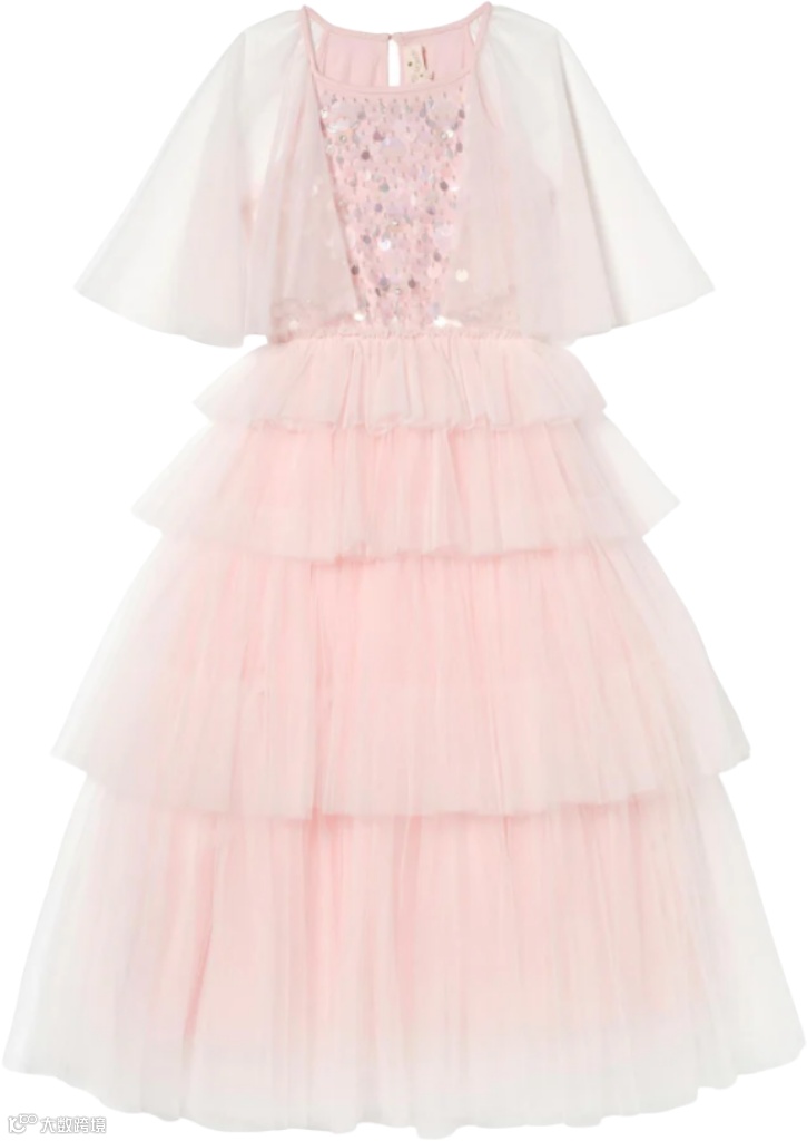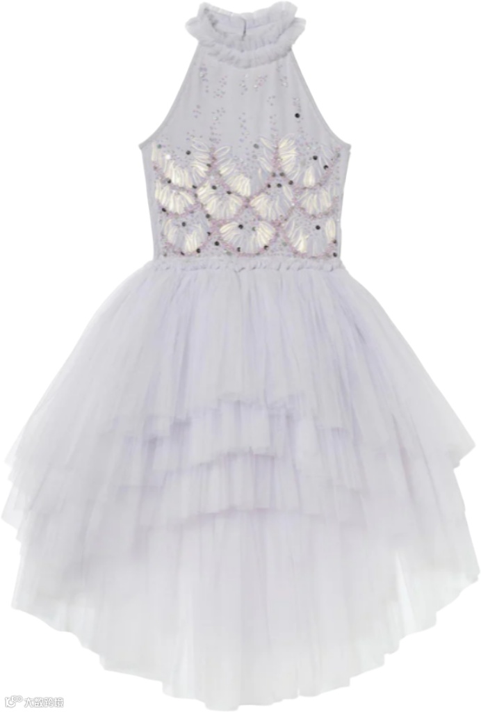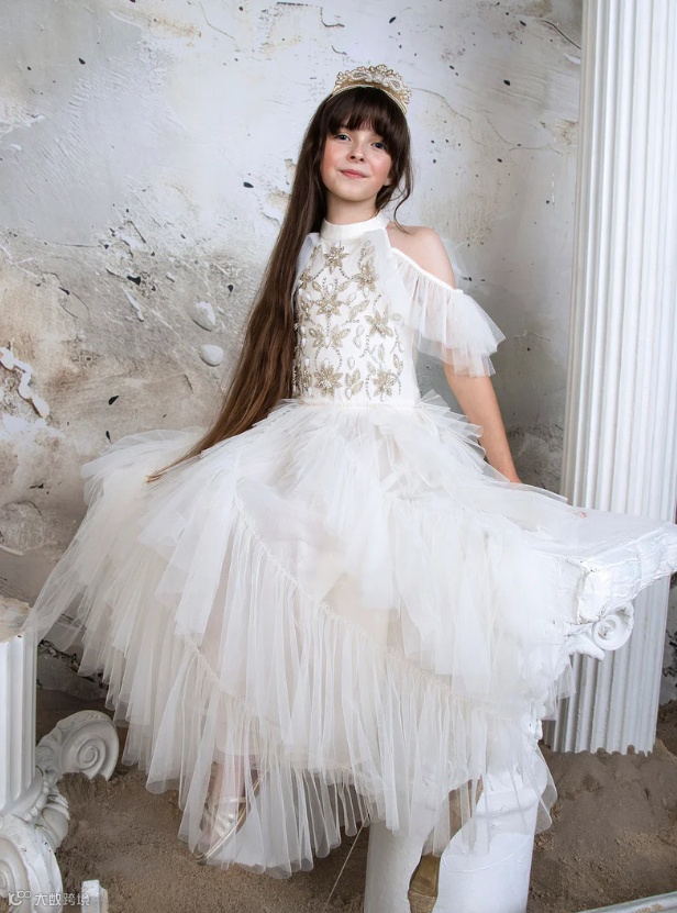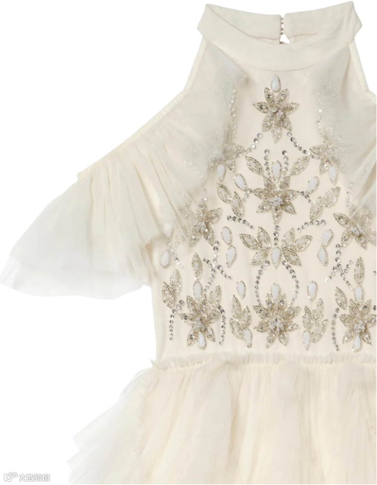 层叠薄纱与流光细节交织,勾勒出丰盈廓形。上身点缀精致装饰,向下渐变为亮片花卉纹样,将高定细节与童趣浪漫巧妙相融。