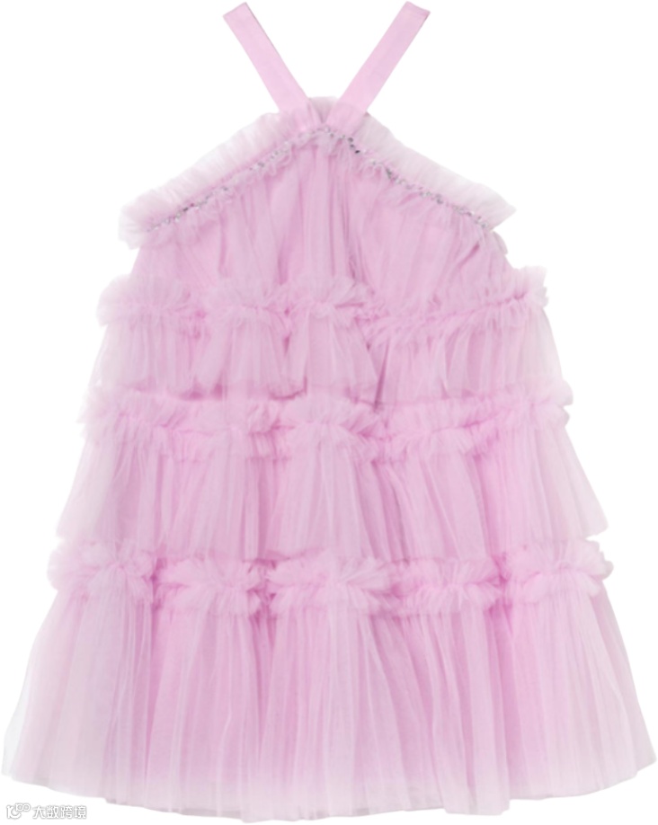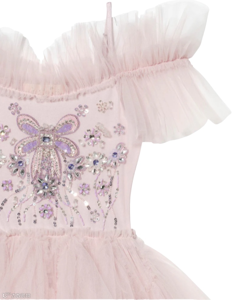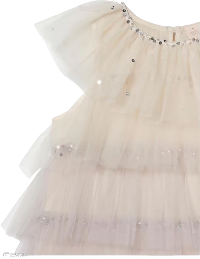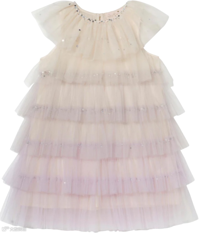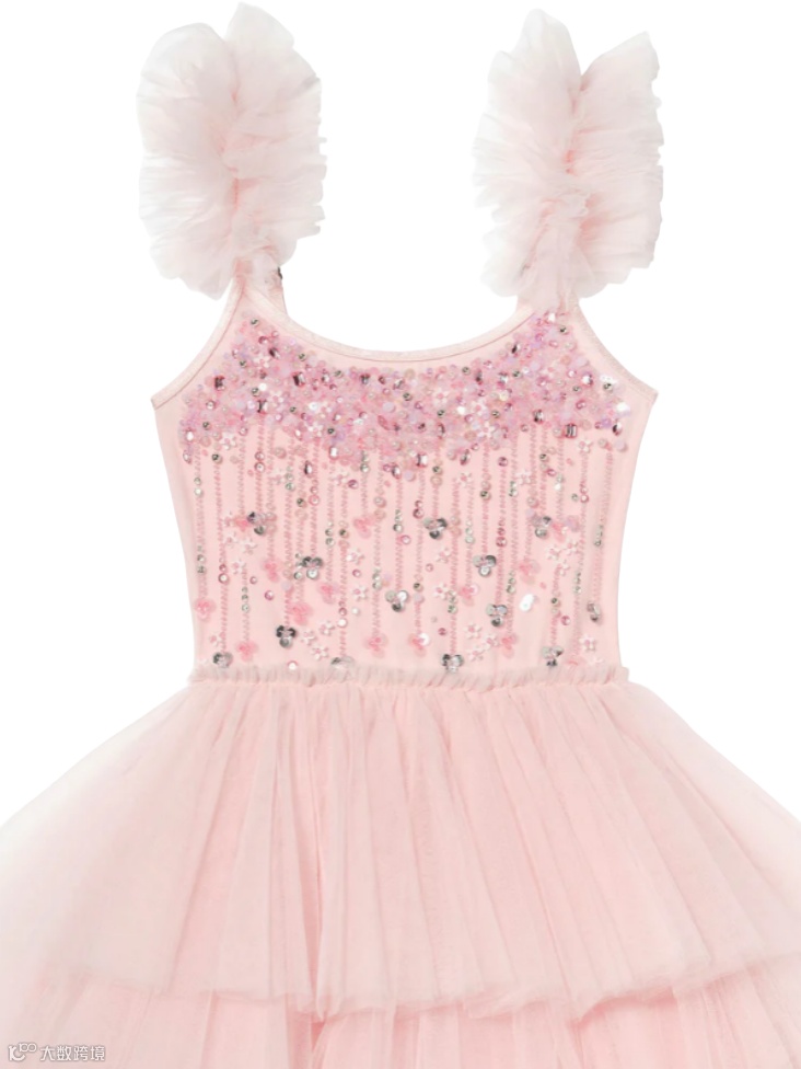 层叠薄纱与流光细节交织,勾勒出丰盈廓形。上身点缀精致装饰,向下渐变为亮片花卉纹样,将高定细节与童趣浪漫巧妙相融。