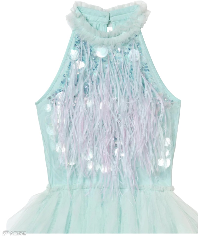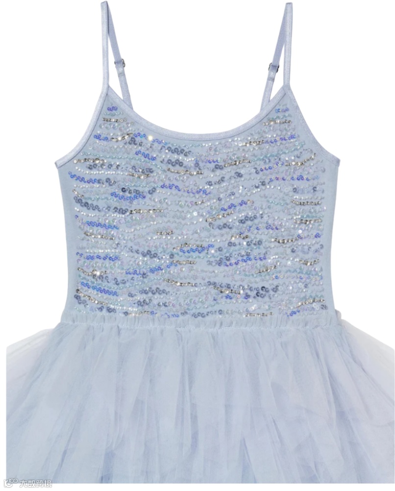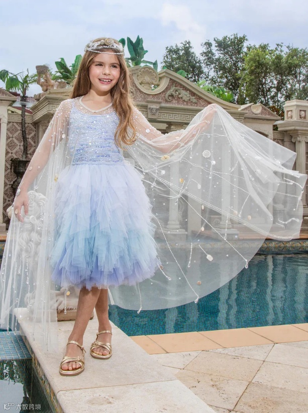 薄纱裙摆如海浪层叠垂落,晕染梦幻海洋蓝渐变。裙身以波浪纹理排布,步履间流转细碎光芒;肩带可调节,兼顾舒适与贴合度,专为心中藏着小美人鱼的她打造一场魔法绮梦。