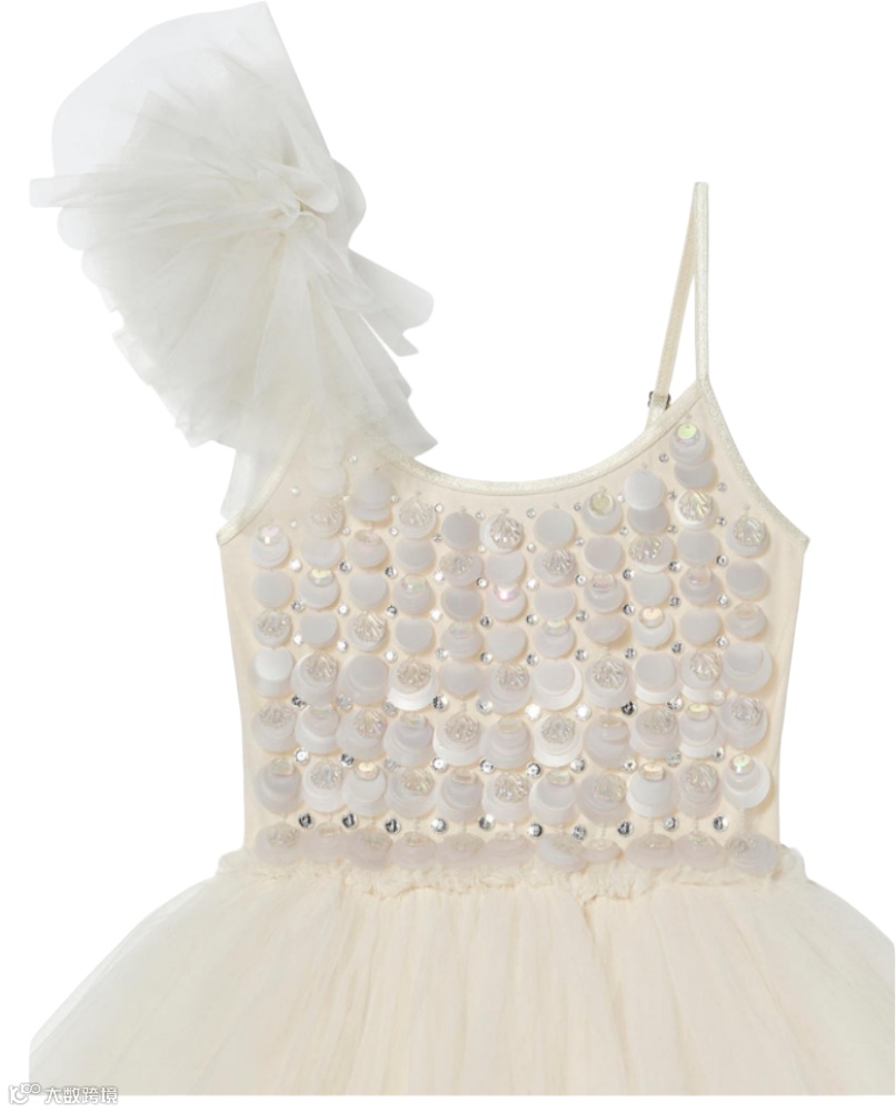 高低错落的薄纱裙摆轻盈飘逸,单侧荷叶袖设计别致灵动;上身点缀宝石与仿珍珠大亮片,尽显俏皮童真与优雅女神气质。