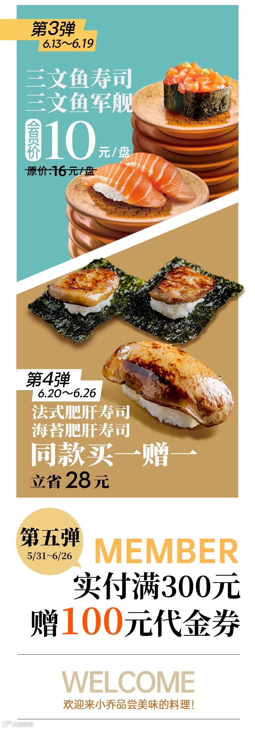 活动 | 小乔回转寿司新菜单、新价格,三文鱼寿司&三文鱼军舰 会员限时10元!
