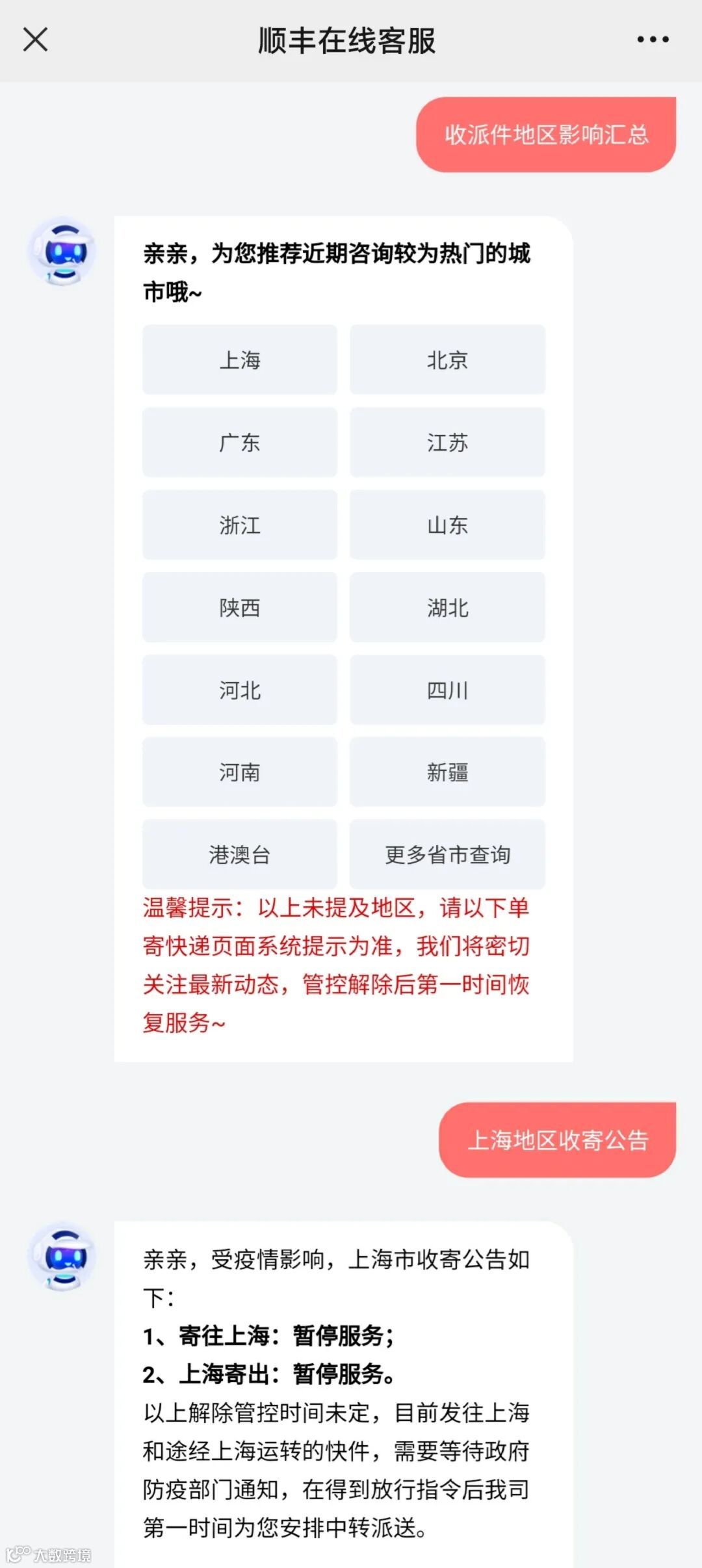 据顺丰最新消息了解,上海、北京、广东、江苏、浙江、山东、陕西、湖北、河北、四川、河南等全国十几个省市地区受疫情影响,快递网点暂停收派件服务。